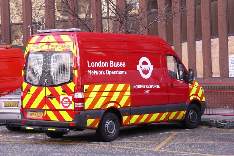 Details: Aldgate Bus Station was host to one of the new London Buses vans on 16th February 2008, and this view shows the rear of 6368M. Similar but older 5799M is to the right. The office buildings in the background, which have cast long shadows over the bus station for many years, have been out of use for some time. |