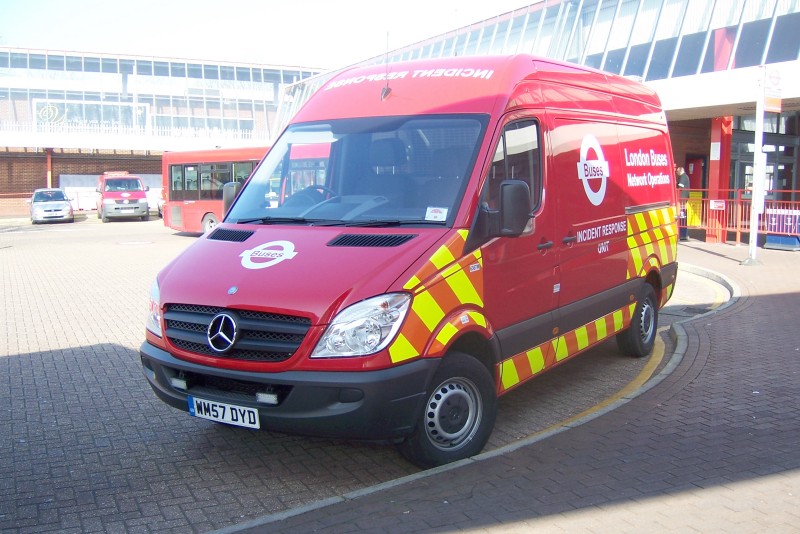 Details: The batch of Mercedes-Benz Sprinter vans leased in early 2008 for use as Incident Response Units looks set to be the largest consecutively-numbered group of service vehicles for many years. When this picture was taken at Eltham Bus Station on 18th February, 20 had been reported and the fleetnumbers spanned a range of at least 24. In the background is one of the roving low-roof VW Transporters, 6012VW, which has been seen at a wide variety of locations. |