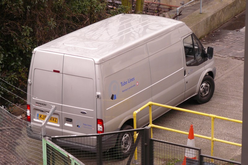 Details: There are quite a few silver-liveried service vehicles, but very few are operated by Tube Lines. One that is is Ford Transit van 6027F, seen on the 'bridge' at Lillie Bridge on 28th February 2008. Note how indistinct parts of the logo are against the body colour. |