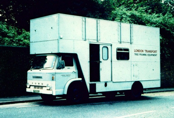 Details: Tree loppers or pruners were a minor but constant feature of the London Transport fleet, especially in the years prior to 1970 when services ran quite far out from London. At first, time-expired buses were used but a move to purchasing specialist lorries was made in 1962. After 1970, just 1 such vehicle was deemed necessary, and in 1976 a Ford D1010 lorry was bought and numbered 1935F (KJD935P). As the picture shows, this featured a tall body, although the upper parts were in fact open to contain a working platform. Two drop-down flaps were provided on the nearside to increase the reach of operators, while access was through the main body, which also featured crew accommodation. Note the drainage port above the cab. Pruning duties were later turned over to local councils and specialist contractors. |