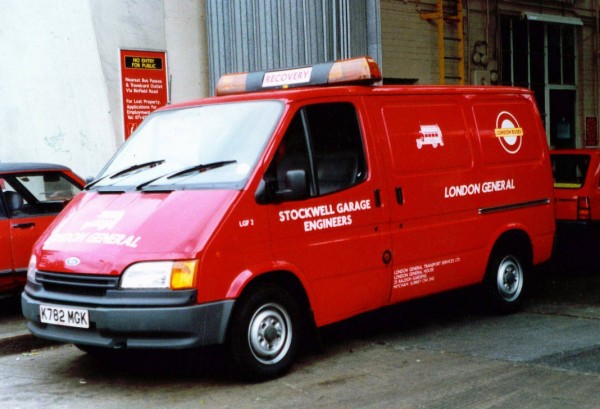 Details: London General was one of the bus operating units created in 1988/89, and it used the rather incongruous image of a B-type bus as its logo. In 1993 it started a new number series for service vehicles leased directly rather than through CDS, and these were prefixed LGF (for Ford products) or LGV (for Vauxhall). LGF2 (K782MGK) seen at Stockwell bus garage, was a standard Ford Transit van fitted with a roof-mounted light-bar, and carrying a profusion of logos and lettering. The number series was only used for the first 8 vehicles taken. |