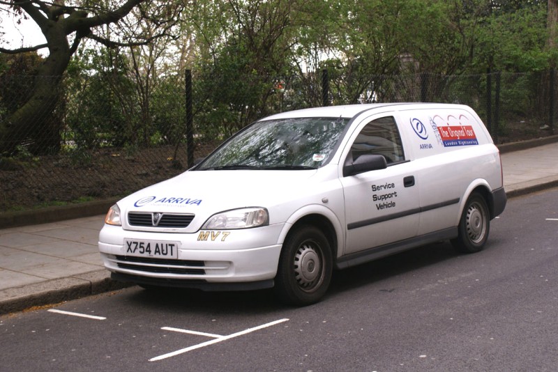 Details: The traditional style fleetnumbers carried by service vehicles of Arriva's London Tour operation are a nice touch but slightly at odds with the rather modern livery worn. MV7 is a Vauxhall Astra van seen at Temple Station on 6th April 2008. |