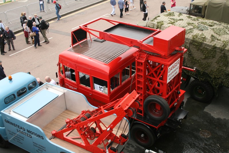 Details: AEC Mercury tower wagon 89Q from the LT Museum collection took part in the HCVS rally to Brighton on 4th May 2008. By lunchtime it was hemmed in by similarly vintage machines, making photography difficult. Damon took this unusual view from the elevated promenade, usefully showing some details of the tower lifting gear and platform. |