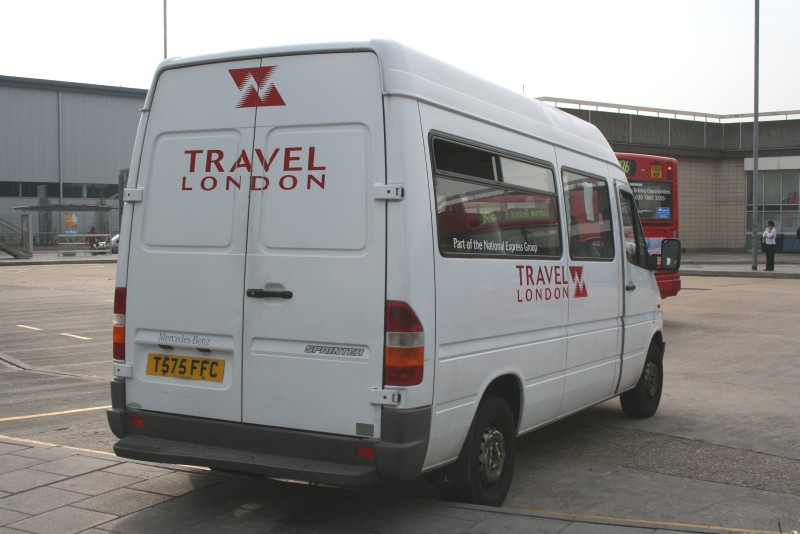 Details: Although allocated new fleetnumber 8931 on paper, Mercedes-Benz Sprinter minibus T575FFC of the Travel London fleet was still carrying its 875 number (dating back to its TGM days) when seen at Hatton Cross on 10th May 2008. Numerous crew ferry vehicles visit this location during the day and, while Travel London mainly uses minibuses, Transdev employs a fleet of Ford Fiesta vans. |