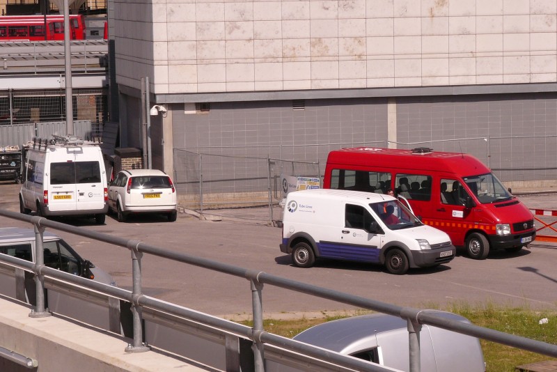 Details: The reconstruction work at Stratford Jubilee Line Station is nearing completion, and more of the yard has been reopened for use. Parked there on 28th June 2008 were five service vehicles carrying four different liveries. To the left are white Transit crew van 6340F and white/blue Focus estate 5760F. To the right are mail van 6215F making a delivery and, more interestingly, former LBSL VW LT minibus 5613VW. As can be seen, this retains LBSL red/orange livery but has had Tube Lines labels applied. Just visible in the bottom left is silver Ford Tourneo minibus KD55MHA. The van in the bottom right is not thought to be a service vehicle. |