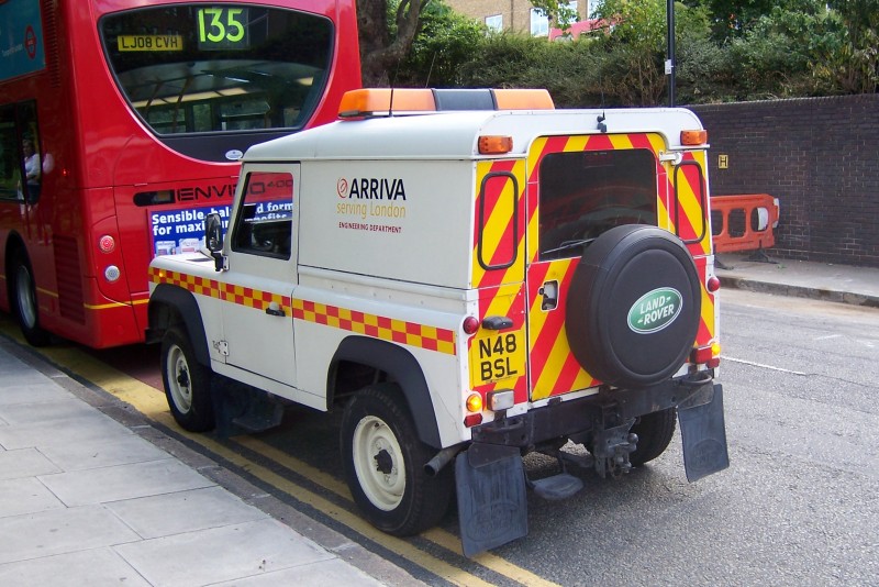 Details: The repainting of Arriva London Land Rover N48BSL is more apparent from the rear (again, compare to this 2006 view). Note that the side windows on the rear have been covered over. One minor change is the loss of the Arriva logo from the spare wheel cover. Seen at Crossharbour on 25th June 2008. |