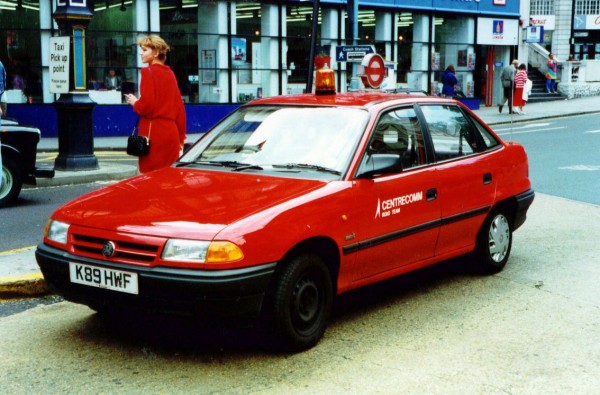 Details: The roof-mounted roundel, so long a feature of inspector's cars, made a surprise and (so far) final appearance on this un-numbered Vauxhall Astra Merit car in 1993. As this picture taken at Victoria bus station shows, it was initially lettered for the Centrecomm Road Team, later replaced by the London Transport Buses logo and lettering. |