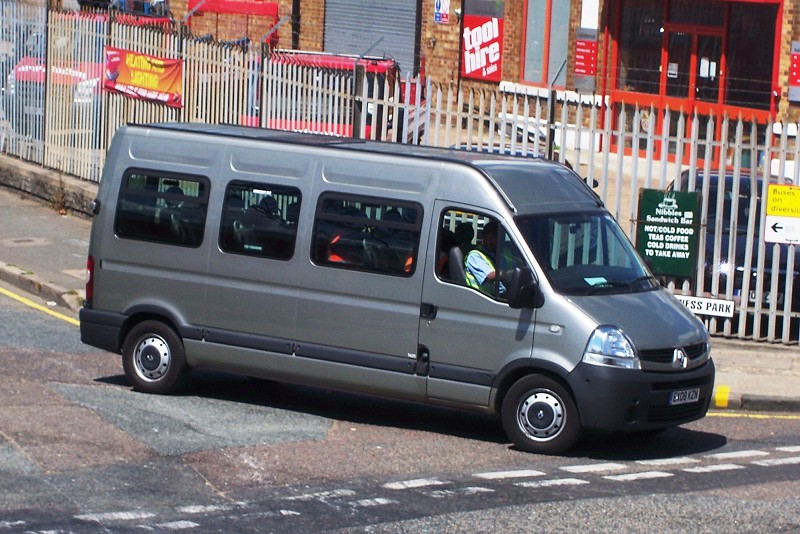 Details: A new series of crew ferry minibuses for East London started appearing in late June 2008, with reports so far from West Ham and Bow. The batch is numbered in the 960xx series and is divided between Renault Masters (as seen here) and the smaller Renault Trafic model. 96015 (EX08KZN) was caught on 3rd July turning out of Cody Road near the new West Ham garage. It was making the short run to West Ham station. Although unlettered, small fleetnumbers are carried low on the sides and in the windscreen. |
