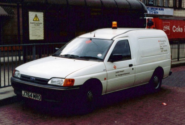 Details: For a time in the early 1990s, service vehicles allocated to bus stations carried an all-white livery and additional lettering for the Bus Passenger Infrastructure unit. An example of this is Ford Escort Van 4151F (J764MRO), new in late 1991 and photographed at its main base, Finsbury Park station. Note the additional red roundel on the windscreen. |
