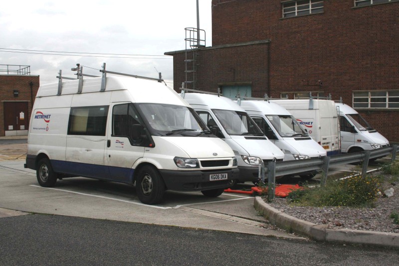 Details: An interesting find at Hainault Depot on 30th September 2008 was this line up of Metronet vans headed by high-roof Ford Transit 5890F. Sister vehicle 5891F is also present, while the other three are from the batch of five Mercedes-Benz Sprinters vans leased in 2005. All five vans shown are allocated to the Metronet Electrical DLO, whose vehicles can also be seen at Acton and are only regularly active at night. Note that both the Transit vans appear to be missing some roof bars, while there is a noticeable difference between the shade of white used by the two manufacturers. |
