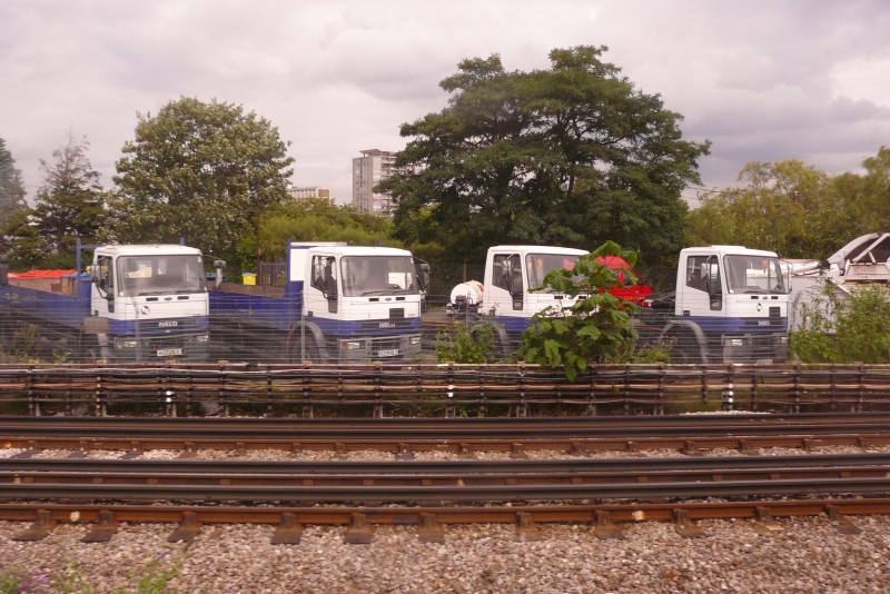 Details: Withdrawn lorries are often stored at the south end of the lorry yard at Acton. On 20th August 2008 this neat line-up of four Iveco-Ford Super Cargo lorries was seen from a passing train. All had had their logos and lettering removed, and the two demountables to the right were body-less. Visible in the background is one of the four red Volkswagen minibuses, some of which are now in use on tube-related work. |