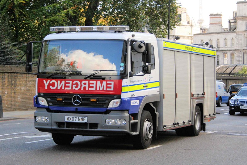 Details: This view of ERU Mercedes-Benz Atego 2597 heading up Grosvenor Place on 22nd October 2008 shows an interesting recent development. Near the bottom of the cab door is a label bearing the name of the lorries home base. Could it be that someone read about our difficulties in keeping track of the allocations of these vehicles?! It is certainly hard to see a real operational need to identify them in this way. |