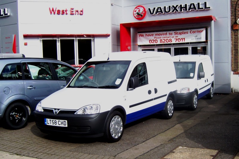 Details: Although the fleetnumbers are barely visible in this view, these two Vauxhall Combo vans seen at the Vauxhall dealership on Edgware Road on 23rd October 2008 are 6597V (front) and 6649V (behind). Ray therefore takes back the highest SV pic for a while! As the sign on the building behind shows, the dealership had actually moved to Staples Corner in the preceding week (Hopefully these vans were awaiting collection rather than having been forgotten about). It is unlikely that the new location will afford views such as this in the future. |