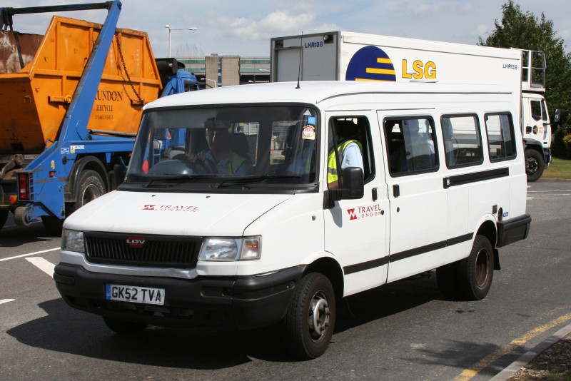 Details: Many of the service vehicles in the Travel London fleet were acquired second-hand from the Royal Mail, and hence came in a suitable red livery. One batch that did not were three LDV Convoy minibuses allocated to Fulwell and used as crew ferries in a white livery. GK52TVA was caught at Hatton Cross on 30th July 2008. |
