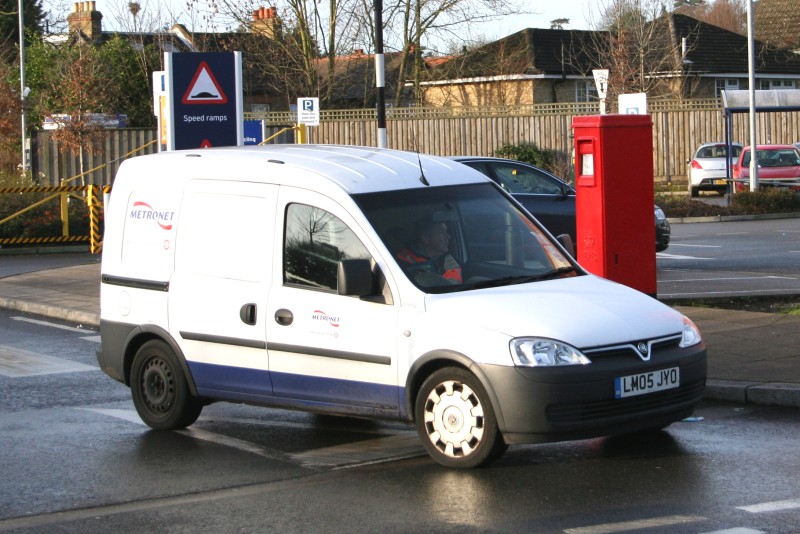 Details: Vauxhall Combo van 5785V works for Metronet but is fairly elusive, only having been reported twice. On 19th December 2008 Colin found it arriving at (or is it leaving?) Loughton Station. Note the missing wheel trim and the offside cargo door (the nearside had both wheel trims and another door). |