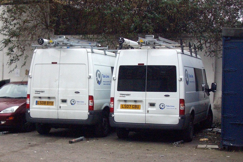 Details: It is always nice to discover new SV locations, especially when they are ones where any resident vehicles can be clearly seen and photographed! I was rather surprised to find these two vans in a small yard on Union Street near the junction with Borough High Street, barely half a mile from my workplace. It may be a temporary allocation but the same pair have been there for most of the past month. The pair of Ford Transit crew vans are from the JNP signalling department, recognisable by the plain white livery and the tube and gubbins on the roof. Similar vehicles can often be seen at Neasden, Stratford and Finchley. 6436F (LS08BYX) on the left has 'Jubilee Line Signal Dept' lettering below the Tube Lines logo, and solid rear doors. LS07GBU lacks the extra lettering and has windows in the rear doors. It also lacks a fleetnumber, but I would not be surprised if it was allocated number 6341F. Picture was taken on Christmas eve 2008, whilst I was on my way to a very quiet day at work! |