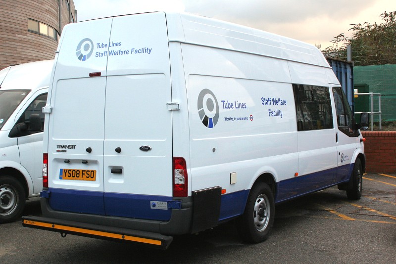 Details: A development in the past year or so has been the delivery of a number of vans for use as Staff Welfare Facilities. The examples seen so far have all been 'Jumbo' Ford Transits, either crew vans (with additional side windows, like 6463F) or plain vans (like 6464F). YS08FSO has side windows on both sides, and seems to be based at Stratford Station, where this picture was taken on 9th December 2008. The most recent examples have been registered in Yorkshire, perhaps due to their conversion work by a firm called Clarks (badge visible on rear), although the earlier ones (see links above) were in more usual Kx series. One other curiosity on these vehicles is that the Tube Lines logos on the cab doors are applied lower down than standard. This vehicle is no doubt allocated a fleetnumber but it unfortunately does not carry it. |