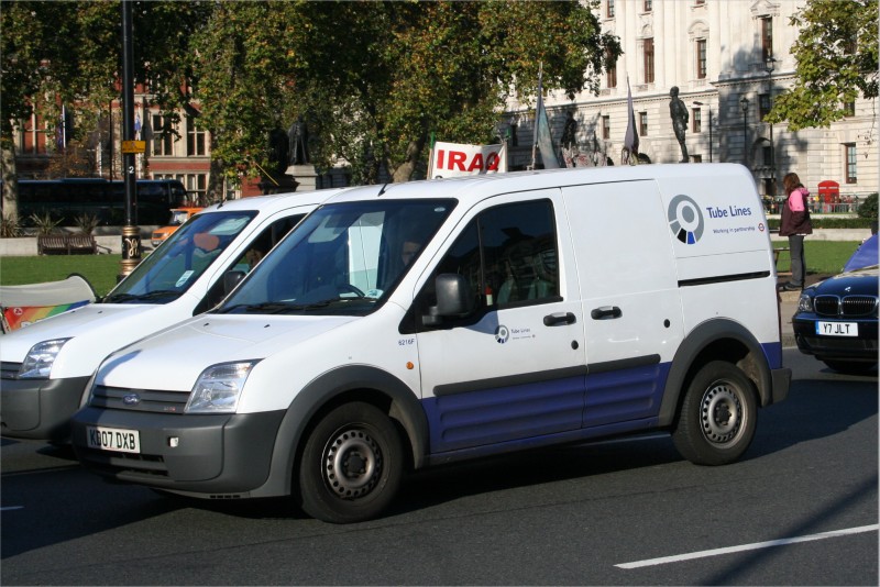 Details: Ford Transit Connect van 6216F is another vehicle that has already been illustrated here, and is one of the internal mail vans in the Tube Lines fleet. This picture taken at Parliament Square on 28th October 2008 is notable for the fact that it was waiting at the traffic lights alongside identical 6217F (although you will have to take my word for this!). Sadly other queuing vehicles precluded a clearer view of the pair. |
