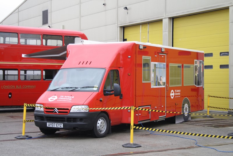 Details: Transport for London Citroen Relay exhibition unit AY07EYZ was present at the Acton Museum Depot open day on 2nd November 2008. The vehicle is used as part of the Safety and Citizenship program aimed at schoolchildren, and focuses on the use of buses in London. Although a three-axle vehicle, the twin rear wheels are covered on both sides by mock bus wheels when in use. |