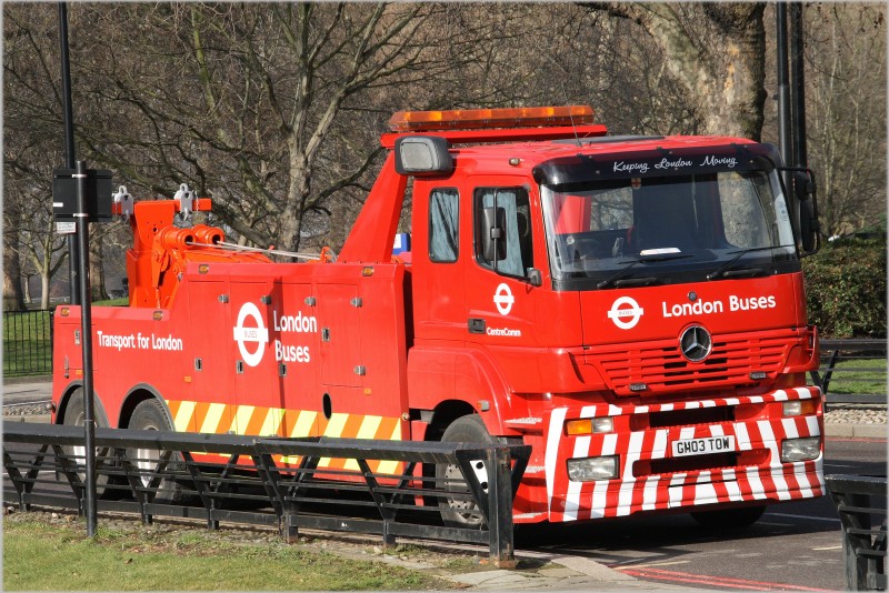 Details: A new LBSL red tow truck appeared in February 2009, the contract for the provision of this having been awarded to Sovereign Recovery. As well as the livery, the vehicle differs from the bulk of the Sovereign fleet in being based on a Mercedes chassis rather than a Volvo. According to the DVLA website, Actros lorry GM03TOW was built in 2003 and previously carried a silver livery. The new livery differs from that on L100JMH in that it has chevrons rather than squares along the sides, and the lettering now mentions Transport for London and CentreComm as well as London Buses (the CentreComm lettering was last seen on Vauxhall Astra car K89HWF in 1993). One clue to the Sovereign ownership is the 'Keeping London Moving' slogan on the sun visor. As with its predecessor, the vehicle can usually be found parked on Achilles Way at the south end of Park Lane, as here on 7th February 2009. |
