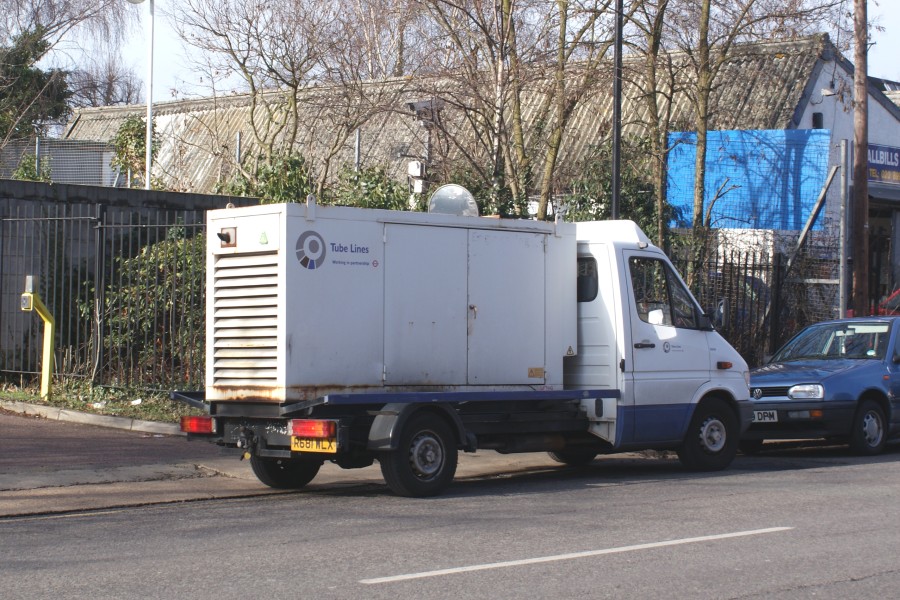 Details: The three Mercedes Sprinter mobile generators in the Tube Lines fleet are seemingly only used at night and are therefore rarely seen anywhere other than at their base of Lillie Bridge. Ray was lucky to come across 2563M at Acton on 12th February 2009. It parked for a while near the Smallbills garage on Bollo Lane. The generator fitted is thought to have been originally painted red and carried by either 2478M or 2480M. |