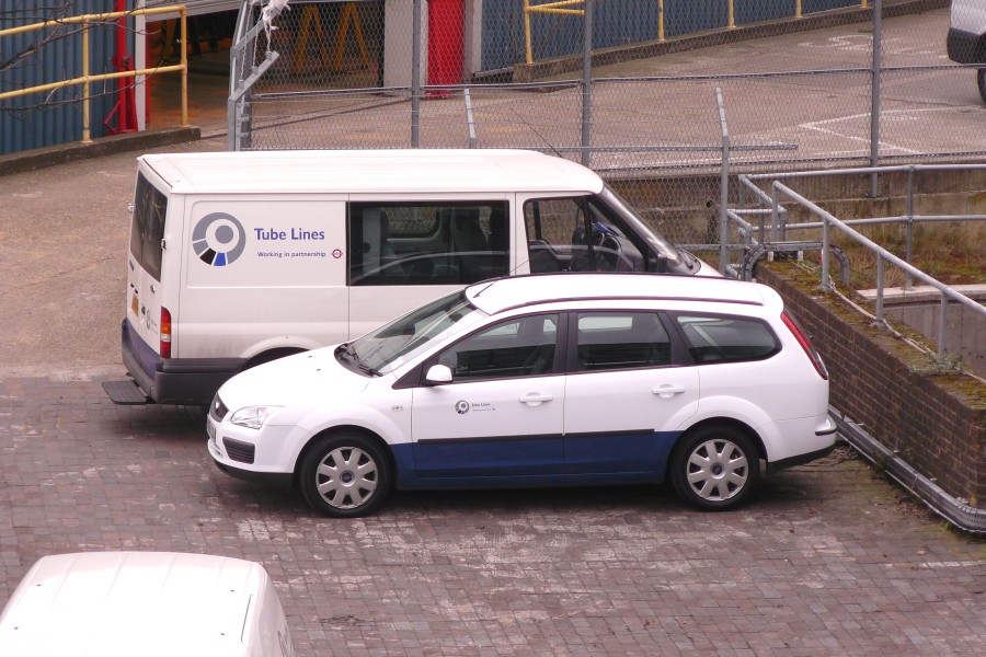 Details: While the main yard at Lillie Bridge tends to be dominated by Metronet vehicles, the small section including the parking area above the District Line is reserved for Tube Lines. Seen there on 3rd March 2009 was Ford Focus estate 6078F (fleetnumber not carried). This is one of four cars (6076F to 6079F) used by the Transplant workshops at Ruislip. Behind is a more normal resident in the shape of Transit crew van 5967F. |