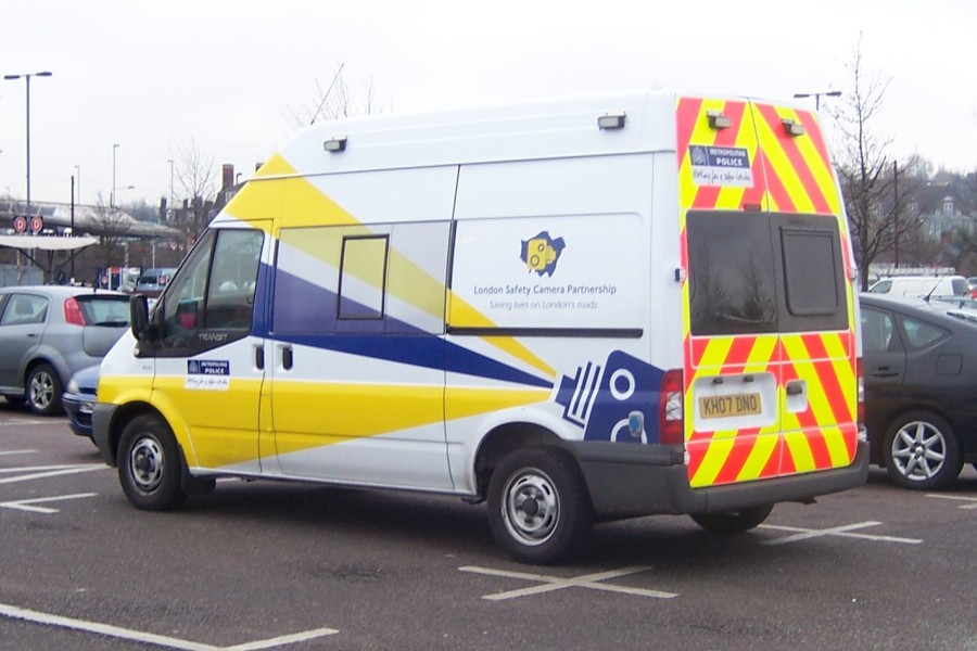 Details: Another view of London Safety Camera Partnership Ford Transit 6121F at North Greenwich on 23rd February 2009. Note the Metropolitan Police lettering, and the large cat-flap in the rear window! |