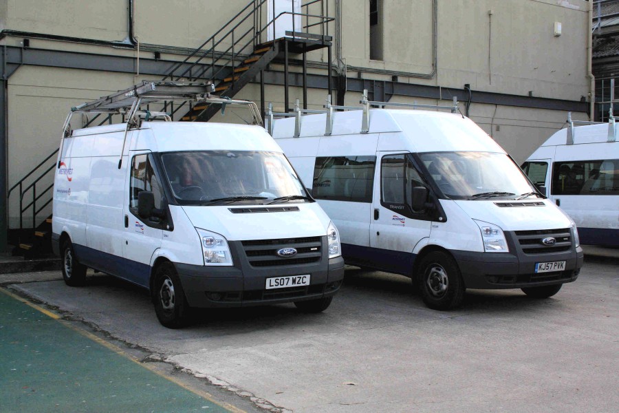 Details: Two 'lesser spotted' Metronet Ford Transits are seen within Acton Works on 5th March 2009. On the left is mid-height van 6294F with ladder racks, while on the right is high-roof crew van 6239F. The LS07 registration on 6294F is unusual, the only other examples being on four Transit crew vans for the Tube Lines signalling fleet. |