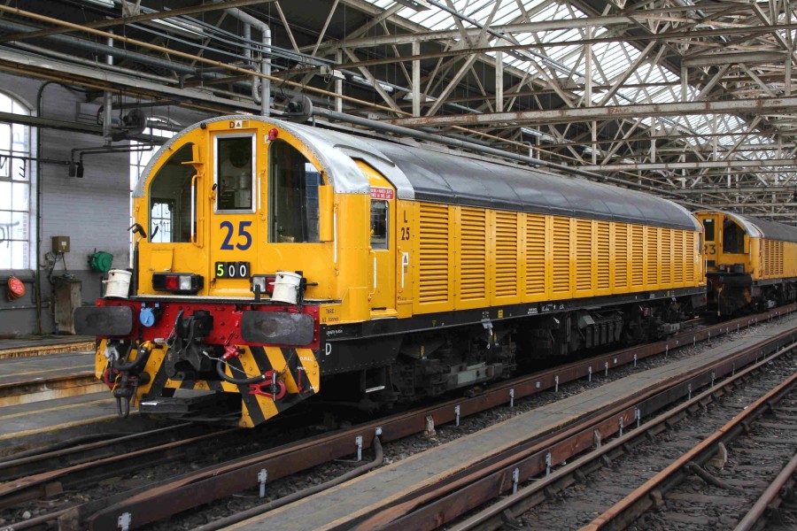 Details: Seen inside the shed at Lillie Bridge on 5th March 2009, battery loco L25 looks as though it has recently been repainted. Built by Metro-Cammell in 1965, this example retains a full set of side louvres (unlike similar L23 in the background). Note the retracted buffers, drop-head buckeye coupling, and screw-link coupling kept on a hook to the left. |