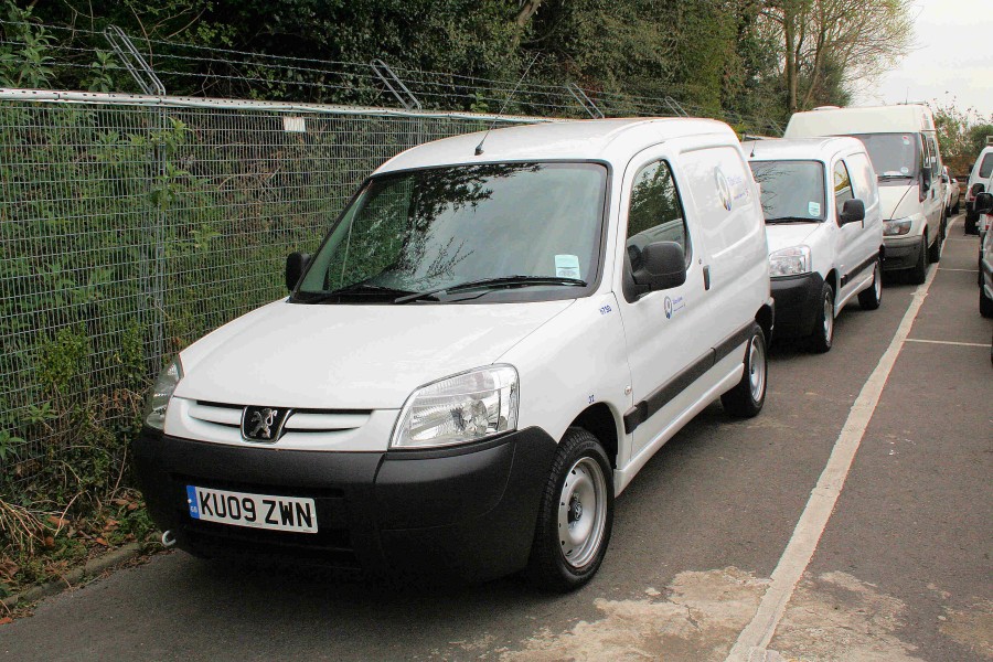 Details: On delivery to Acton, new cars and vans are often parked on what we refer to as the stub road. This sloping area between the tube tracks and the Distribution Services offices used to be the road leading onto a bridge into Chiswick works. The bridge was demolished many years and the road is now marked out on one side as an additional parking area. On 31st March 2009, both sides of the 'road' were in use, with a batch of Peugeot Partner vans having recently arrived. All were white with blue fleetnumbers and minor lettering (tyre pressures and fuel capacities). 6750 nearest the camera additionally carried Tube Lines logos. The vans were not included on a fleetlist obtained the day before so it remains to be seen to what use they are put. Also visible here is a Ford Transit van that appears to be a former police vehicle. |