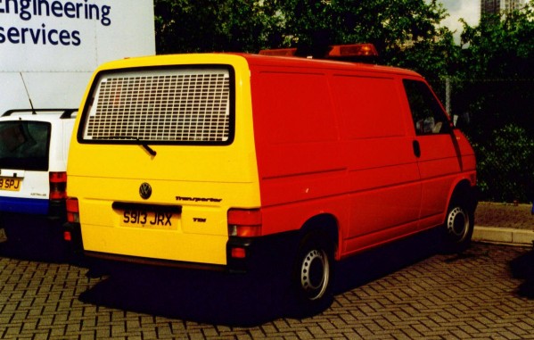 Details: This photo appears to show VW Transporter van 4890VW (S913JRX) in newly delivered condition in the yard at Acton. The only lettering carried is the fleetnumber, while a yellow rear door is fitted, which would soon have had red chevron stripes applied (see 4918VW). Orange side striping is also to be added. |