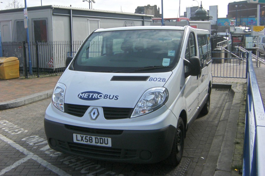 Details: Metrobus acquired 14 Renault Trafic minibuses in autumn 2008 and we are slowly working our way through them all! Seen at Lewisham Bus Station on 11th March 2009 was 8028, the first of the batch, and one of 11 based at Orpington. A 15th vehicle arrived in spring 2009, also for Orpington. |