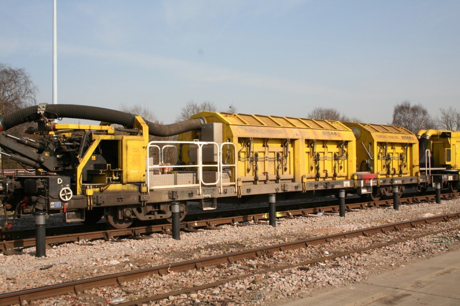 Details: This strange-looking contraption was photographed at Ruislip Depot on 21st March 2009. Lettered as a TUBEVAC I presumed it was used for tunnel cleaning. However a contact was able to put me right so I can reveal that this is in fact a DISAB Ballast Sucker! Its role is to deal with wet spots where the ballast has become waterlogged. Partly out of frame to the left is an articulated hose that can be lowered to track level to allow wet ballast and spoil to be sucked up. The materials are presumably collected in the yellow contraptions, while flexible hoses continue onto the next wagon. The equipment is mounted on a low-deck wagon numbered MW958. Procor built 12 wagons in 1987, formed into 2-car sets with an intermediate low-level coupling. Each pair originally comprised a cement mixer wagon (CM950-955) and a match wagon (MW956-961). CM951, 951, 954 and MW958 were modified as DISABs in about 2005. |