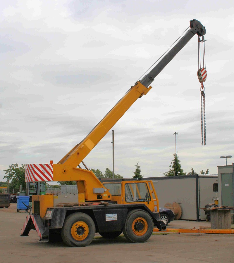 Details: The other yellow crane at Ruislip Depot was also photographed on 12th June 2009, although not in a way that reveals either the make or whether it is road registered. There does appear to be a hirers label on the chassis though. Compared to F561KNL, this crane is smaller with a combined cab. The extending jib is raised by twin rams and the counterbalance is raised to allow 360 degree rotation. |