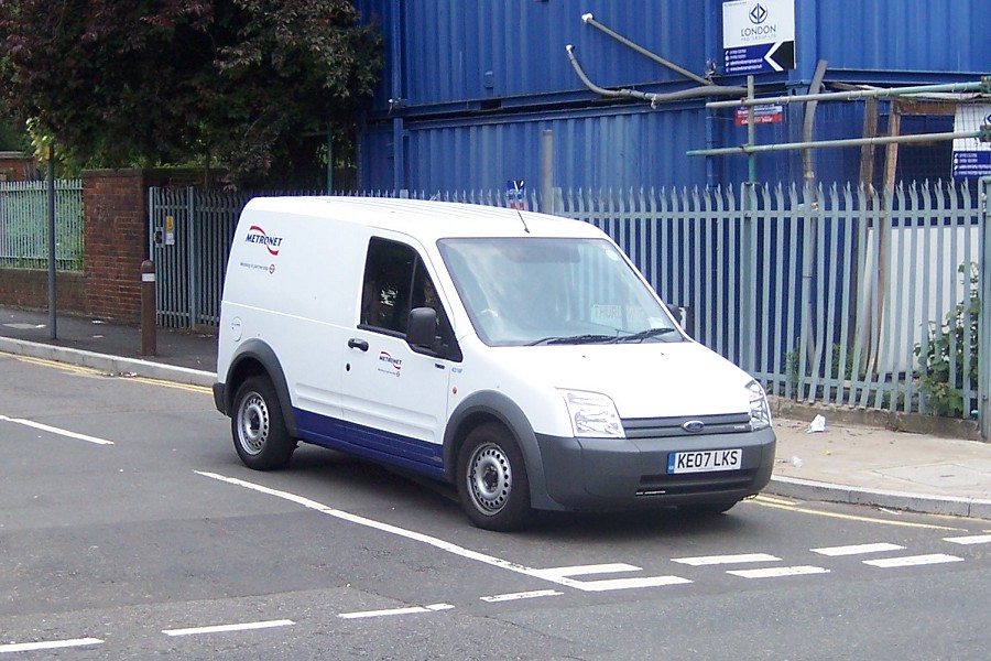 Details: It took me a while to work out why this van looked slightly different! Ford Transit Connect vans usually have a prominent black rubbing strip above the three recesses in the bodysides, and the blue skirt is normally applied up to that level. 6318F, seen here near Hainault Depot on 8th June 2009, lacks the strip and has a very shallow skirt. The van is allocated to the Central Line Track Manager and hence carries Metronet logos. |