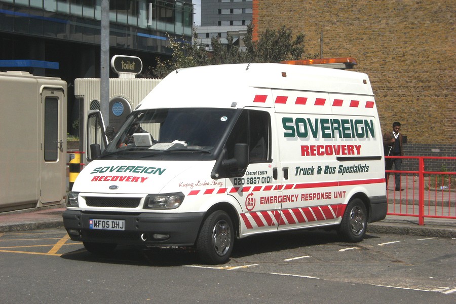 Details: A Sovereign Recovery van can often be found parked at Aldgate Bus Station. On 15th May 2009 the resident was Ford Transit MF05DHJ. This example is slightly unusual in being a high-roof mid-length van. Note the LT roundel on the number plate. |