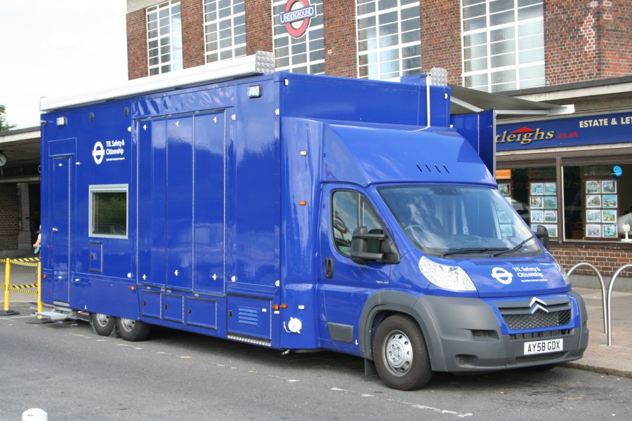 Details: The blue beast! This un-numbered Citroen Relay exhibition unit is similar in configuration to the red-liveried AY07EYZ but the cab is to a later design and the bodywork is even larger, somewhat dwarfing the front end. First registered in February 2009, it was seen at the back of the Acton Museum Depot in early March in company with similarly-liveried Ford Transit 5494F. Although the lettering is different, it is thought to have replaced the latter vehicle in the role of instructing children about safety on the tube (as AY07EYZ does for bus travel). On 31st July 2009 it was parked outside Oakwood Station with its nearside awning extended. The week commencing 3rd August 2009 was 'be safe' week at the LT Museum and both the red and blue vehicles were thought to be attending. However, the tube function was actually performed by a small trailer. |