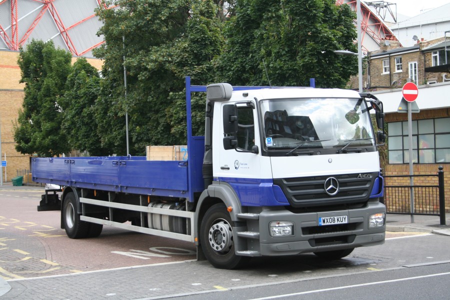 Details: Perhaps the most lorry-like lorries in the current fleet are a trio of Mercedes-Benz Axor delivered in 2008 to replace earlier Ivecos. All have triple-dropsides and nothing else. No cranes, no tail-lifts, no light-bars or toilets! WX08KUY was the last of the three to enter service and was found at Lillie Bridge on 16th July 2009. |