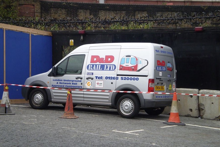 Details: Many contractors are involved in the upkeep of the LUL network, and the vehicles of Cleshar, Morson, GJTV, Balfour Beatty and the like are a common sight around London at night. With perhaps the best livery (but the worst choice of name) is D and D Rail, whose Ford Transit Connect van EN54XBG was found at Waterloo (near the W&C 'hole') on 9th September 2009. |