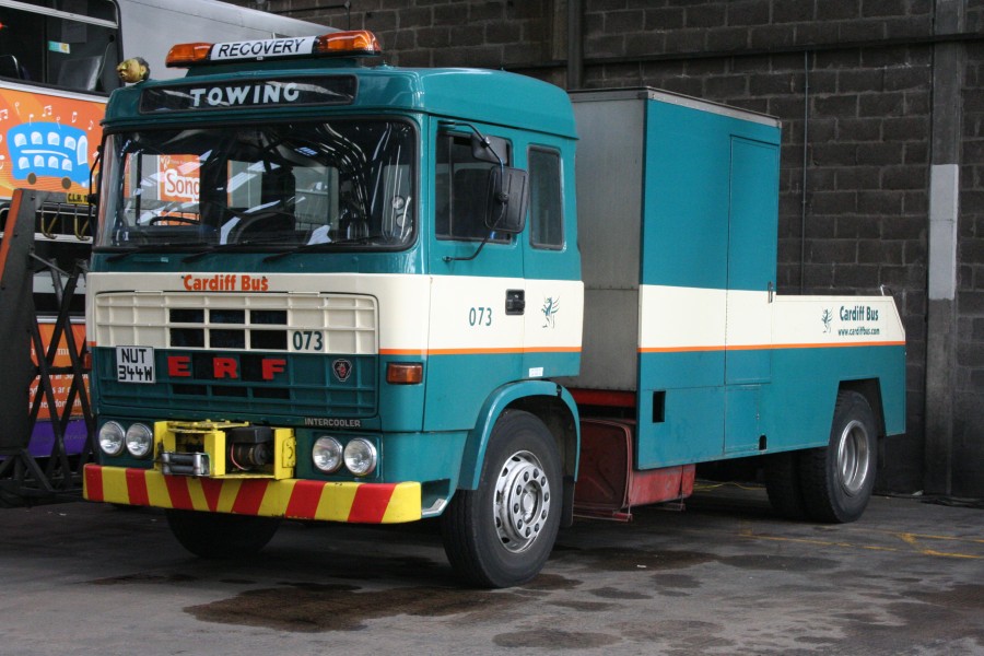 Details: Back to Cardiff again for a view of Cardiff Bus ERF recovery truck 073. Note the Scania badge on the front. 10th September 2009. |