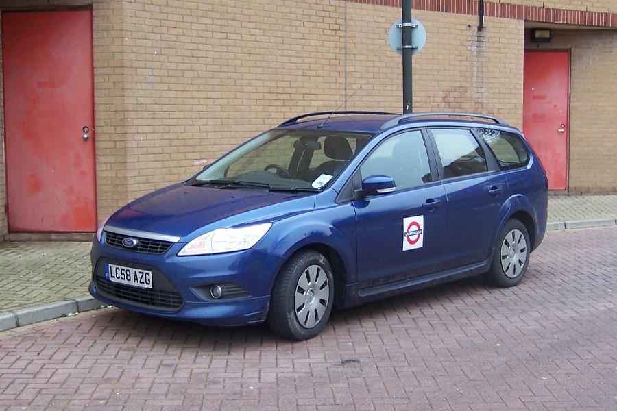 Details: Interestingly, the application of new London Underground logos to vehicles has included a few that latterly operated in anonymous liveries. As such, these become eligible for addition to the database. One such vehicle is Ford Focus LC58AZG, reportedly used by the Automatic Train Control managers section. It is notable however that some of the other unmarked cars used by this team latterly gained small Metronet logos (such as Focus VN56YMD and Mondeo MV58WCP). As such it may be that not all unmarked vehicles will be so treated. Photographed at Leytonstone Station on 18th January 2010. |