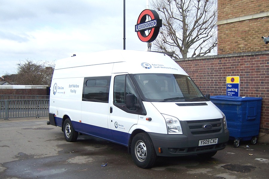 Details: Some of the Staff Welfare Facility Vans have been fitted with very large roundels on top of their cabs, reminiscent of inspector's cars of old. Oh, hang on. 1st April is next week. Let's start again... Ford Transit Staff Welfare Facility van 6805F was found parked outside Northfields Station on 13th March 2010. This is one of the two-toilet versions, all of which have additional side windows on both sides. |