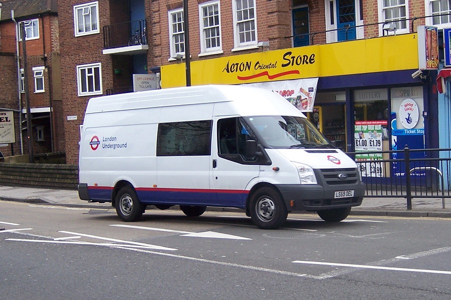 Details: This smart-looking Ford Transit jumbo crew van has been reported three times already, and the fleetnumber has never been caught! Sadly this photograph was not sharp enough to help. Taken at Acton Town station on 25th February 2010 |