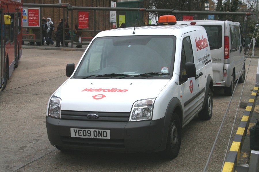 Details: A new Ford Transit Connect van for engineering support duties from Metroline's Perivale West garage was YE09ONO, photographed at Brent Cross Bus Station on 9th March 2010. Details are not available but we believe the anonymous silver Renault Trafic minibus behind is also a service vehicle, doing crew ferry runs to and from the same garage. |