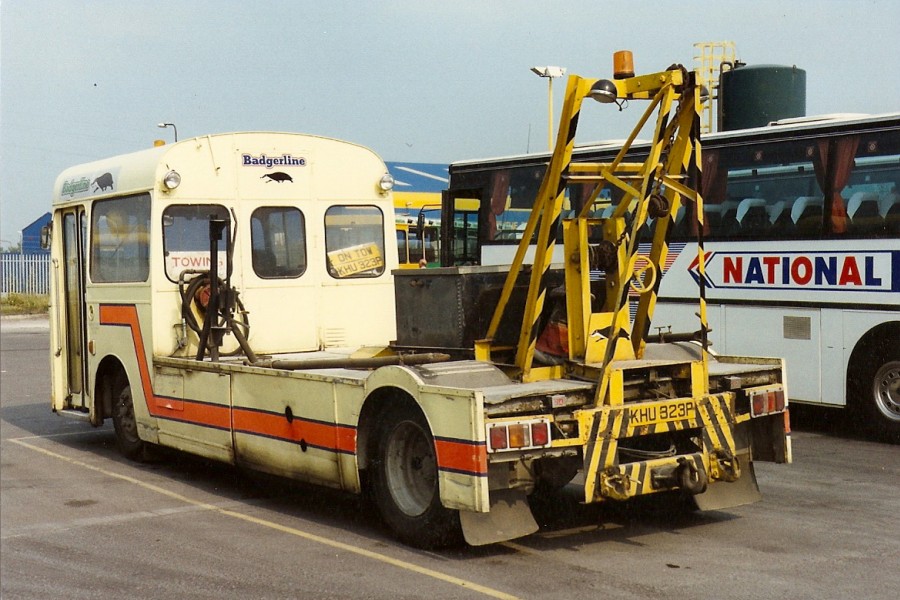 Details: Another view of Badgerline Bristol LH recovery vehicle KHU323P at Weston Super Mare on 27th June 1992 shows off the shortened chassis and rear-mounted towing gear. The neat conversion to the back of the remaining bodywork is visible too. |