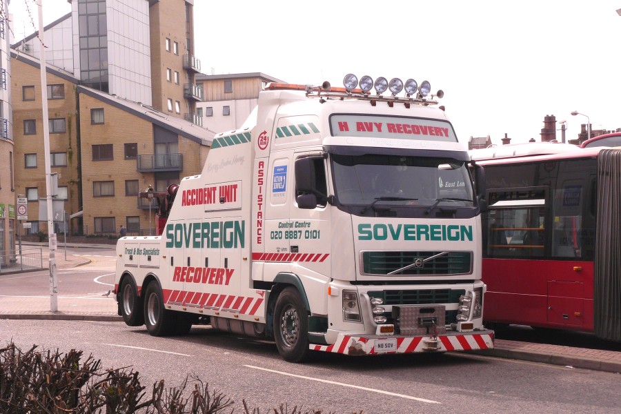 Details: Top of the range members of the Sovereign Recovery fleet are several 3-axle Volvo FH trucks, all with Boniface bodywork. Most of these vehicles carry select registrations with the letters SOV, as shown by N8SOV at Ilford bus stand on 18th March 2010. Some of the fleet carry names on the front domes but this one shows 'Heavy Recovery', albeit without the first E. However, it did have a painted fleetnumber of R06 on the cabside. Note the full-size lifting rear axle. |