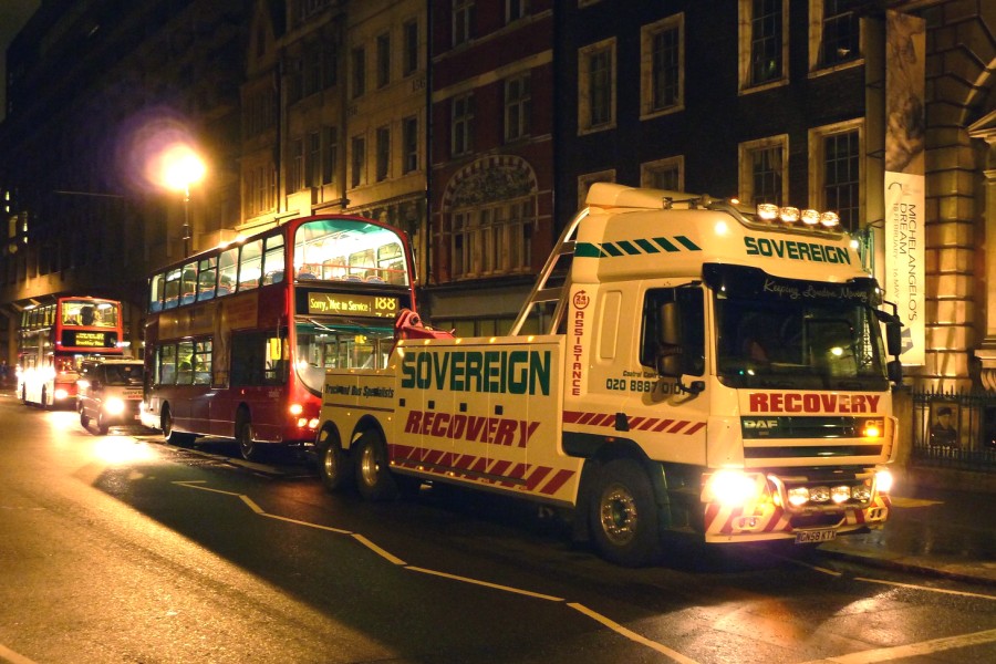 Details: Another fantastic night shot by Graham Brown (see also here) shows Sovereign Recovery GN58KTX on the Strand on 22nd March 2010, rescuing an Abellio Volvo Wright double-decker. One of Sovereign's Ford Transit vans brings up the rear. The larger cab type is fitted to this DAF CF, with extensions behind and above and a small aerofoil on top. The Boniface bodywork has the usual cupboard section with a single step-down behind, while the light-bar is mounted on a tubular framework. |