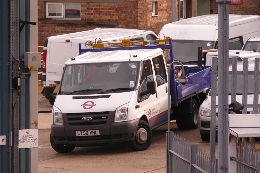Details: London Underground liveried Ford Transit dropside truck 6491F was photographed in Lillie Bridge depot (from the flyover) on 6th April 2010. Also just visible are two of the elusive Renault Trafic vans, including 6639 on the left. |