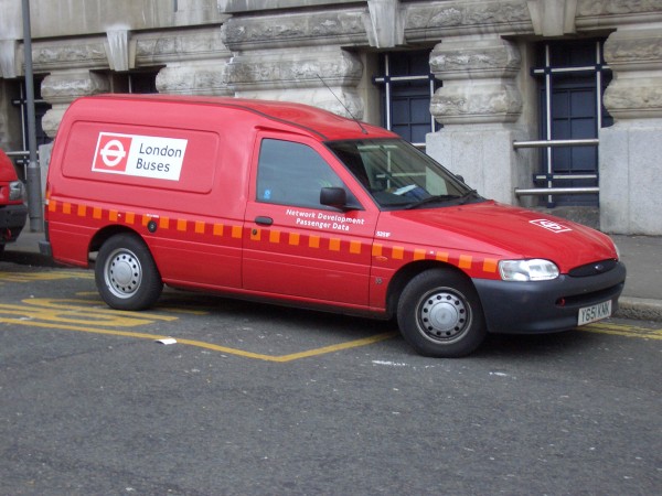 Details: Red Ford Escort vans were very rare in the fleet by 2004. One that is in use is 5251F (Y651KNK), used by the Network Development Passenger Data section and photographed at Waterloo Station on Monday 26th January 2004. This Escort 55 model carries the standard LBSL livery of red with orange squares and large London Buses labels. |