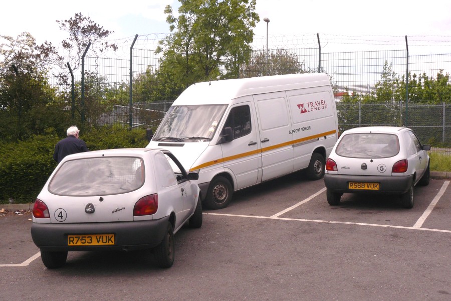 Details: Ray and I visited the Abellio (formerly Travel London) garage at Hayes on 15th May and found no fewer than 12 service vehicles present, along with just 6 buses. However, six of the service vehicles were out of use, dumped in the tiny yard at the back of the main garage building. These are visible from the road (beyond the fence in the background) but we were given permission to have a look around and take some photos. Visible here are two Ford Fiesta vans that started life with British Telecom, and that may have later served Wings Buses. Note that the rear fleetnumbers do not match those on the offside, presumably as a result of door swapping. No.4 (R753VUK) had the door off No.2 (P425MOK, withdrawn earlier in the year), while No.5 (R568VUK) had the door off No.4! In the background is Mercedes-Benz Sprinter van LX51WAJ, which at least had some company lettering, albeit outdated. All these vehicles were allocated 89xx fleetnumbers by Travel London but these were never applied. |